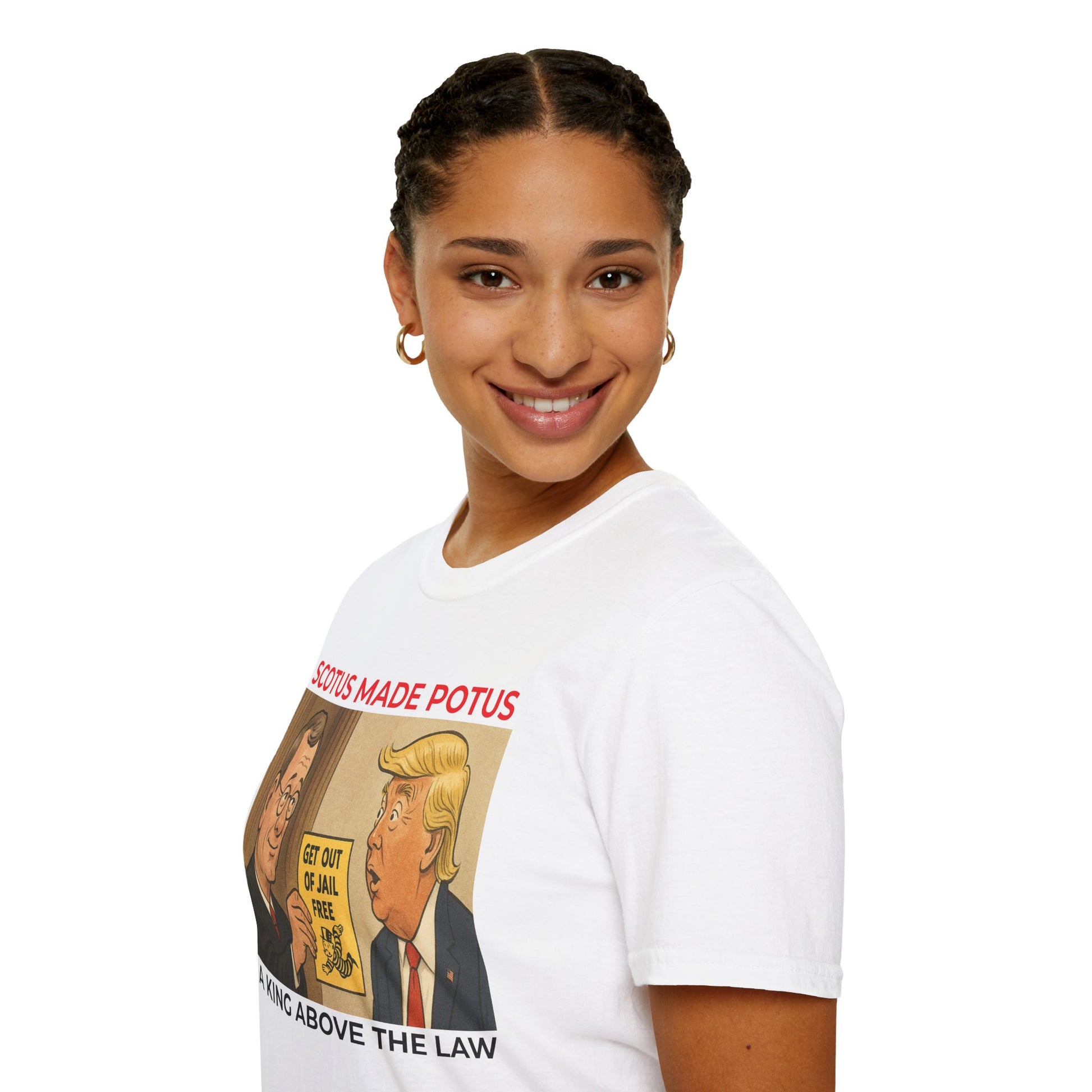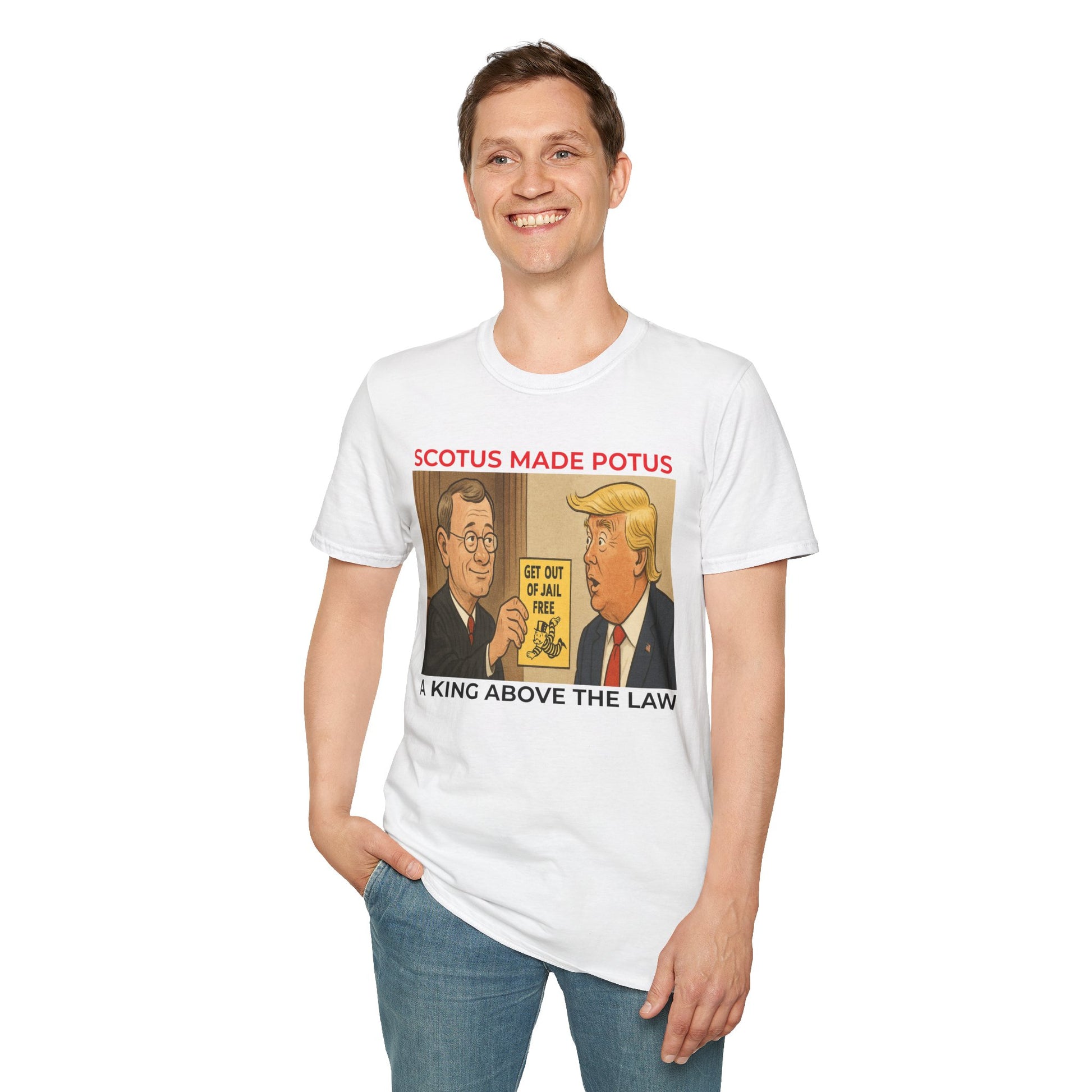 Take a stand against corruption and demand judicial accountability with this powerful two-sided T-shirt. On the Front, a striking political cartoon shows Chief Justice John Roberts handing Trump a “Get Out of Jail Free” card, paired with the chilling message: SCOTUS made POTUS a king above the law.