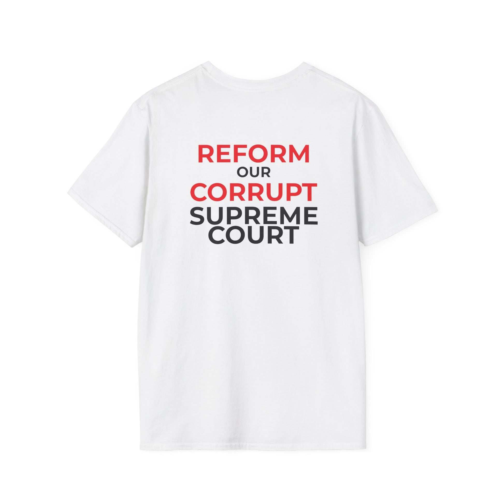 On the Back, the shirt delivers an unapologetic demand: “REFORM OUR CORRUPT SUPREME COURT.” A fearless call to end unchecked power and restore accountability, this design is perfect for protests, rallies, or everyday wear. More than fashion, it’s a call to action for anyone committed to protecting democracy and the rule of law.