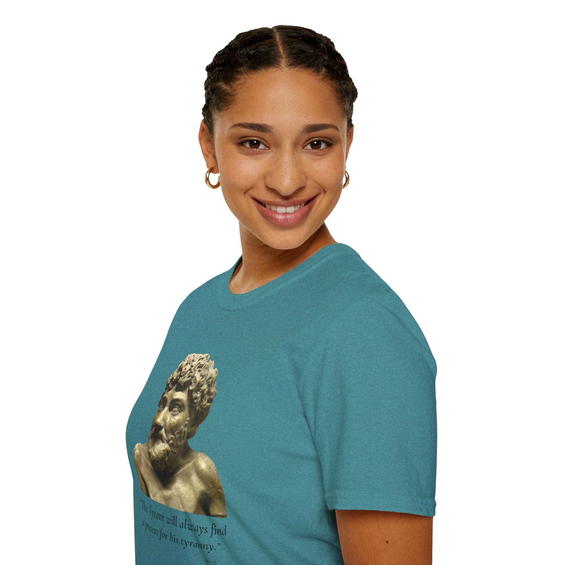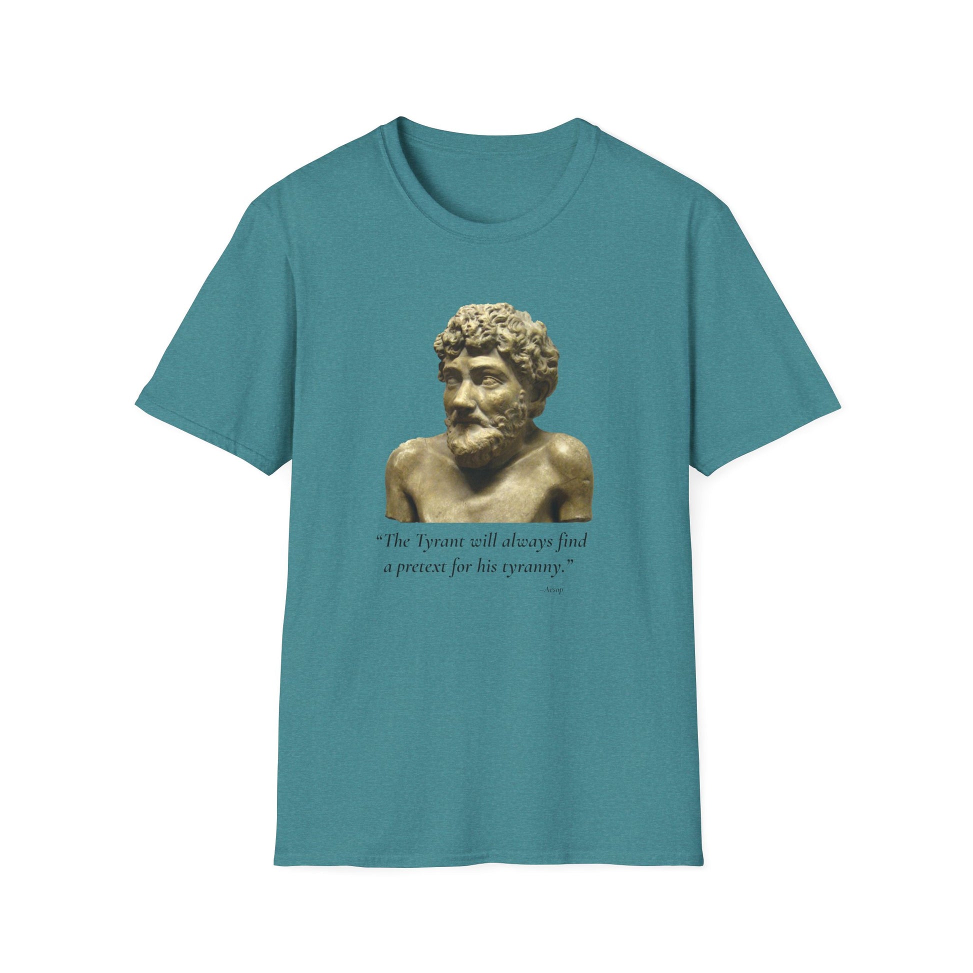 This double-sided HEATHER GALAPAGOS BLUE tee connects ancient wisdom to current struggles, spotlighting how leaders exploit fear to expand executive power. Designed for protests, teach-ins, and everyday conversation, it’s bold, thoughtful apparel that refuses to let tyranny hide behind excuses.