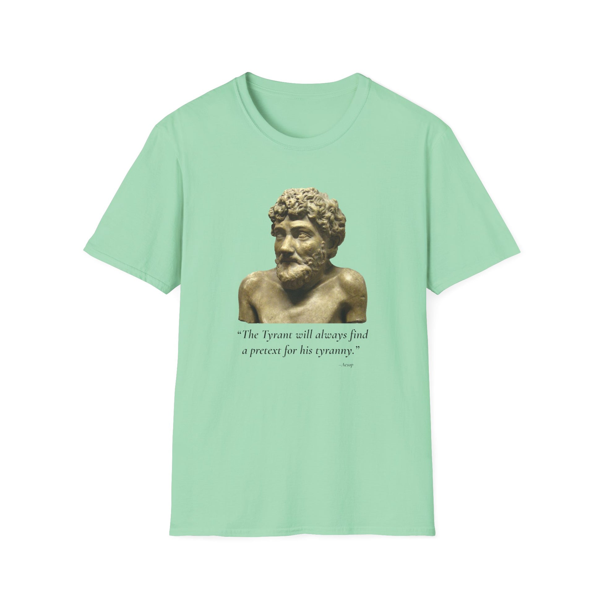 This premium cotton MINT GREEN tee brings that ancient wisdom into today’s battles for democracy. Aesop’s timeless warning sits boldly beneath his portrait, a reminder that tyranny doesn’t arrive honestly—it arrives with excuses. Perfect for protests, town halls, or everyday wear, this shirt is for those who refuse to be fooled by false pretexts and manufactured crises.