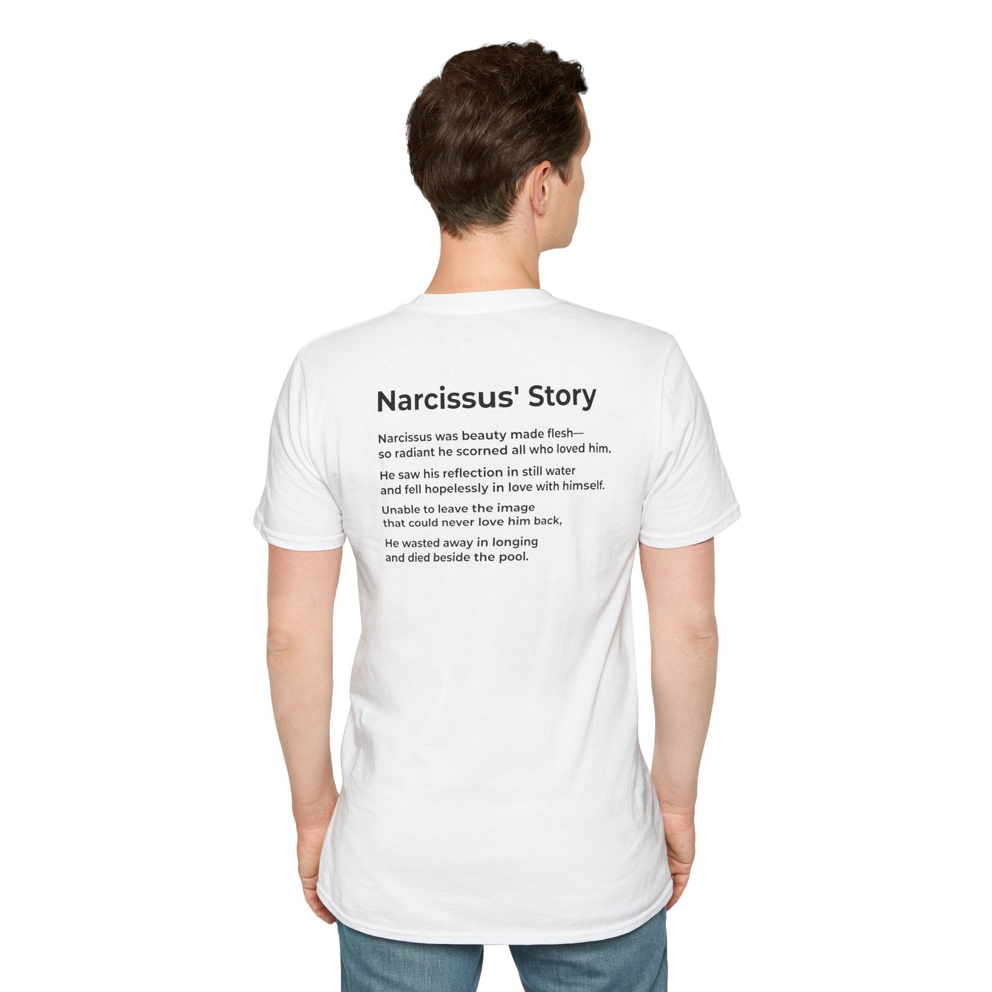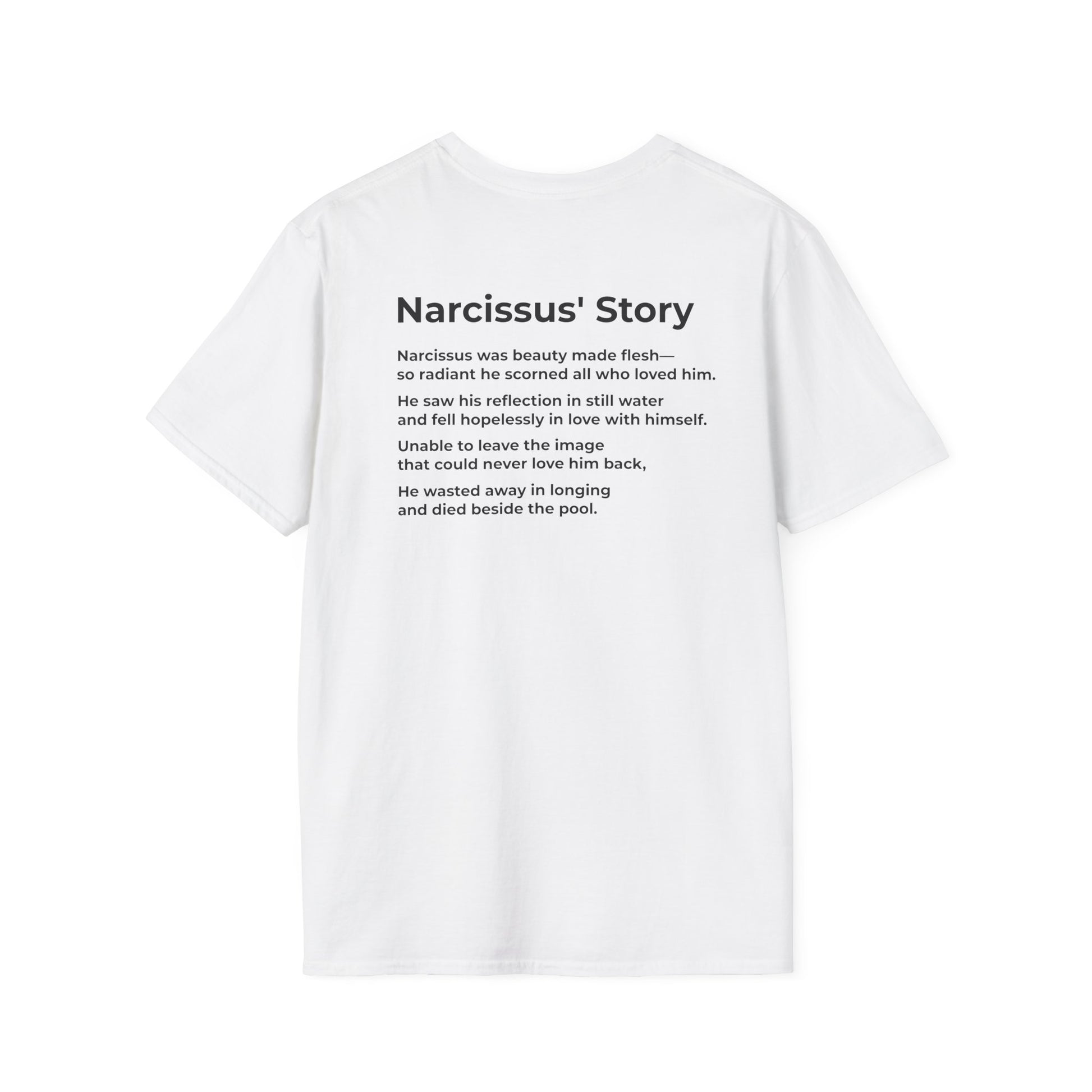 This bold two-sided tee draws a timeless line from ancient myth to modern politics, reminding us that unchecked narcissism still poisons the pool of democracy.