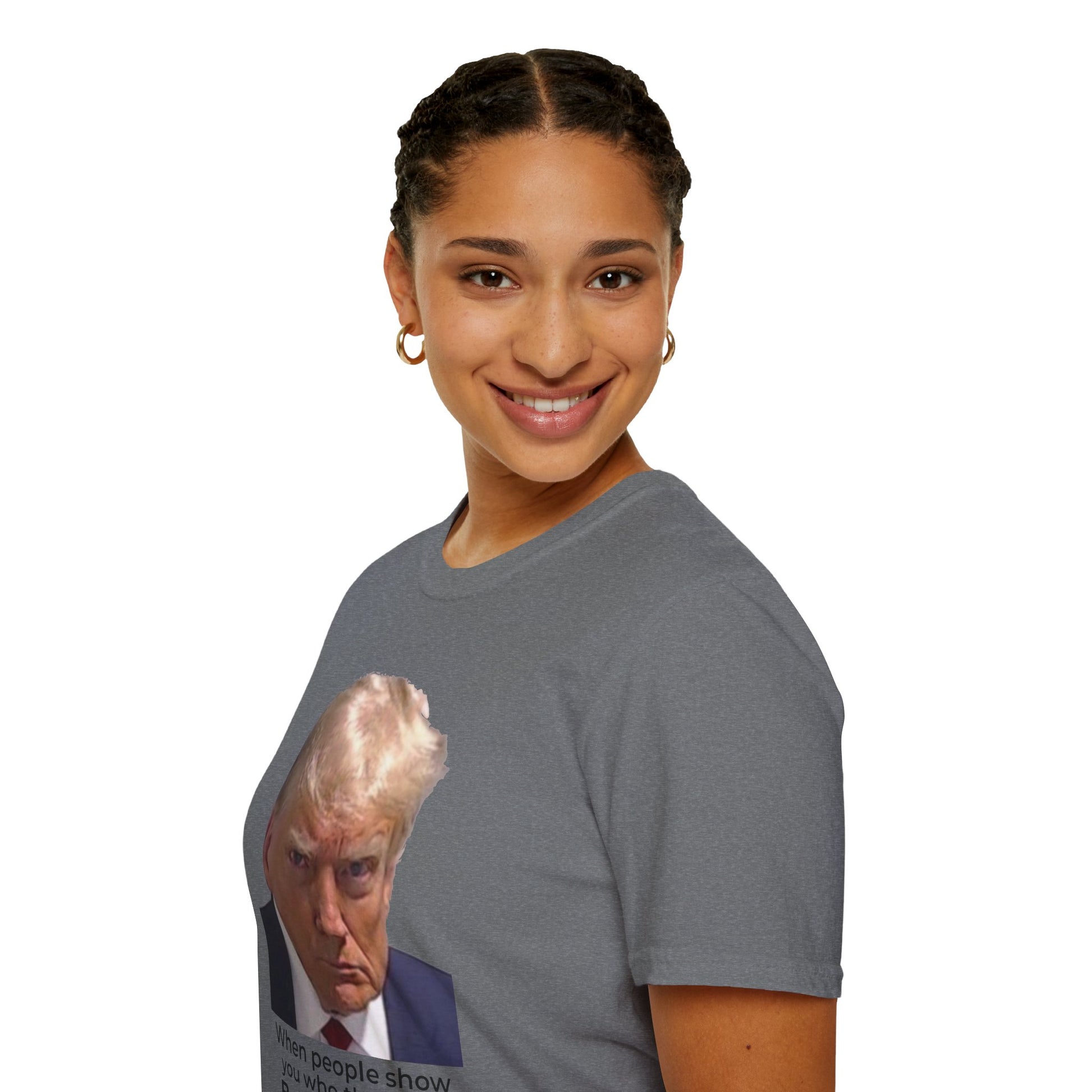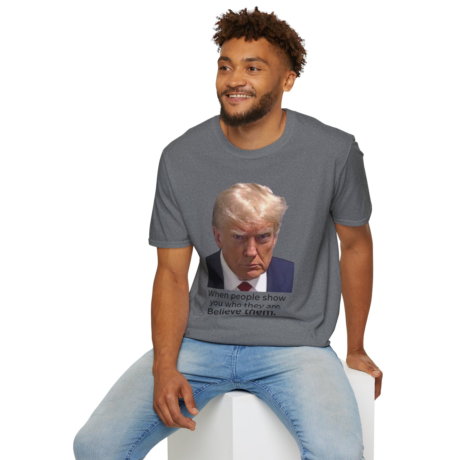 This single-sided tee features Donald Trump’s Fulton County, Georgia mugshot paired with Angelou’s words — a stark reminder that character reveals itself through actions, not slogans.