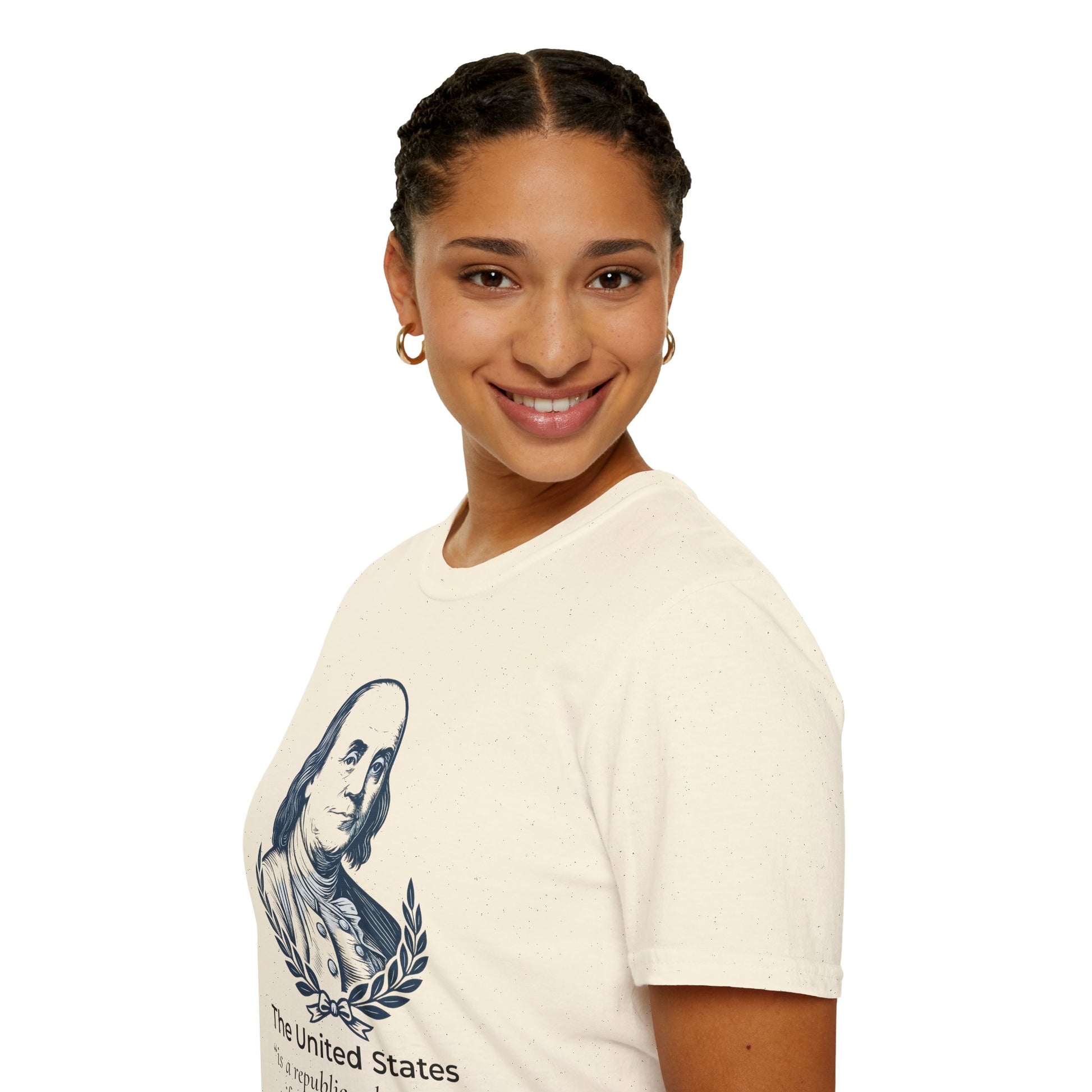 Make a statement with this one-sided design. Featuring a portrait of Benjamin Franklin and his famous reply, “A republic… if you can keep it,” this shirt references his exchange at the close of the 1787 Constitutional Convention. It honors America’s founding principles and the enduring responsibility of citizenship.