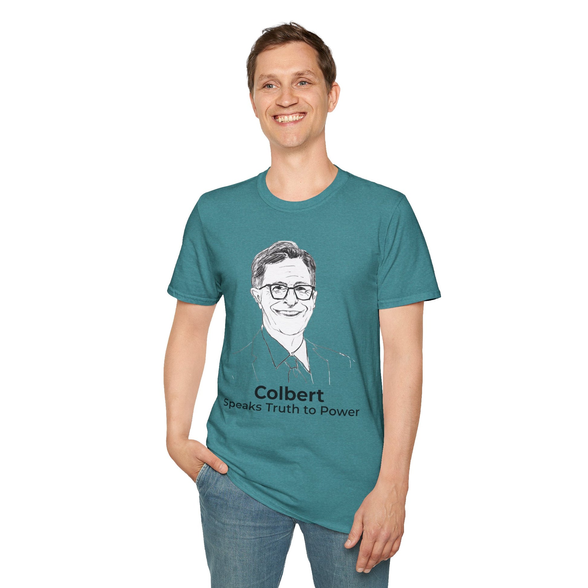 Stand up for free speech and the power of satire with this bold Heather Galapagos Blue double-sided Stephen ColbertT-Shirt.