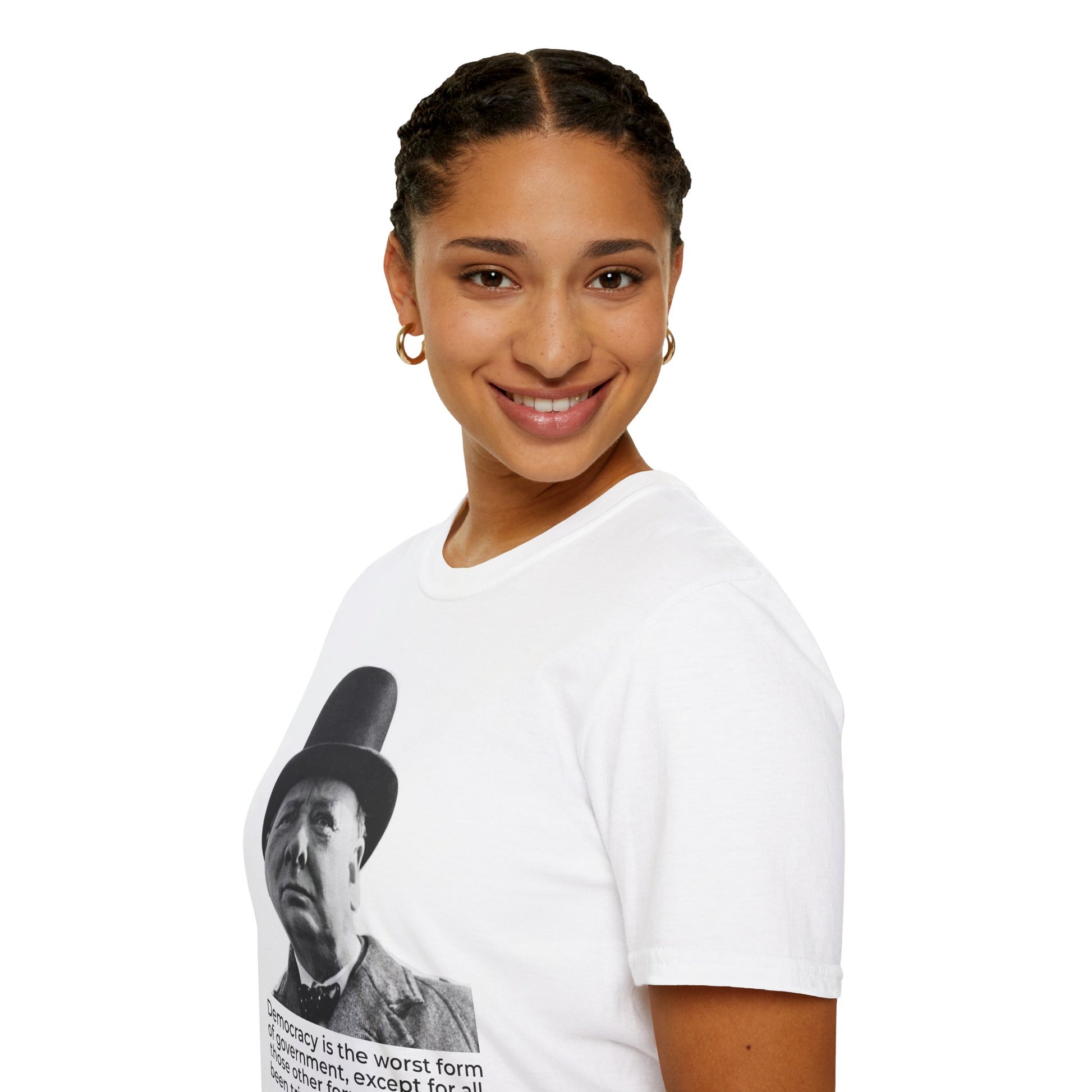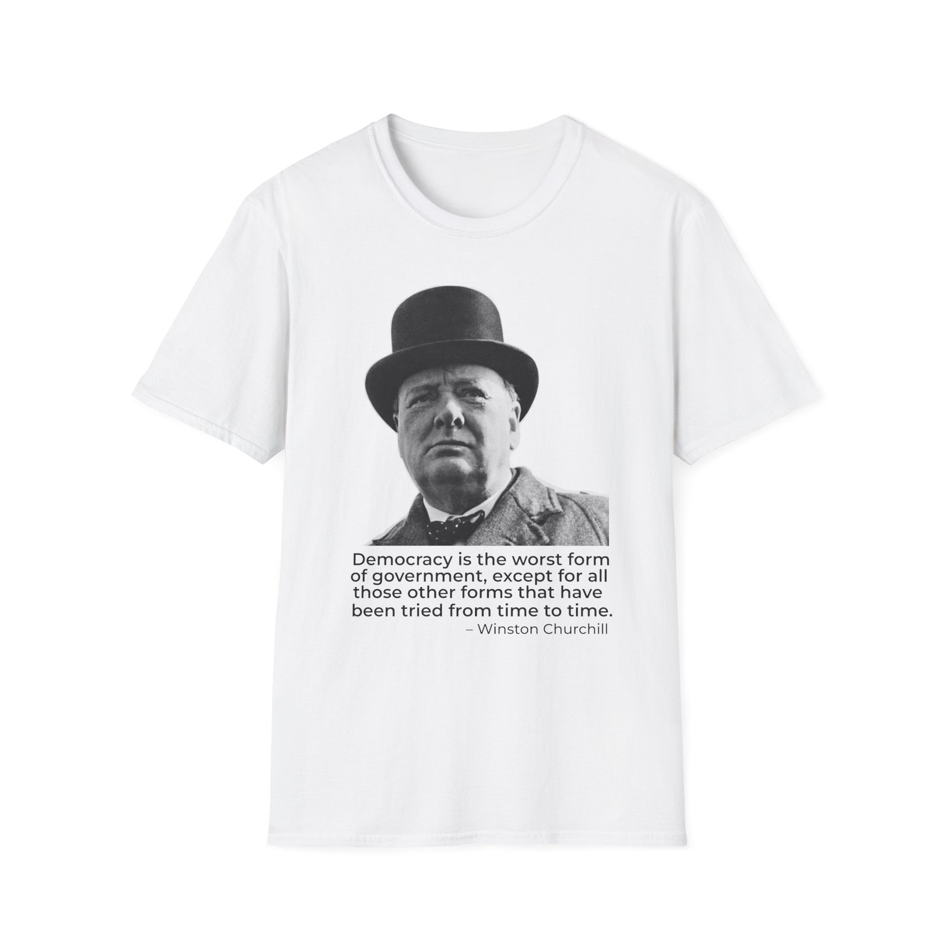This minimalist portrait tee features Winston Churchill alongside his most enduring observation on democratic government—a statement that acknowledges democracy’s flaws while affirming its necessity.