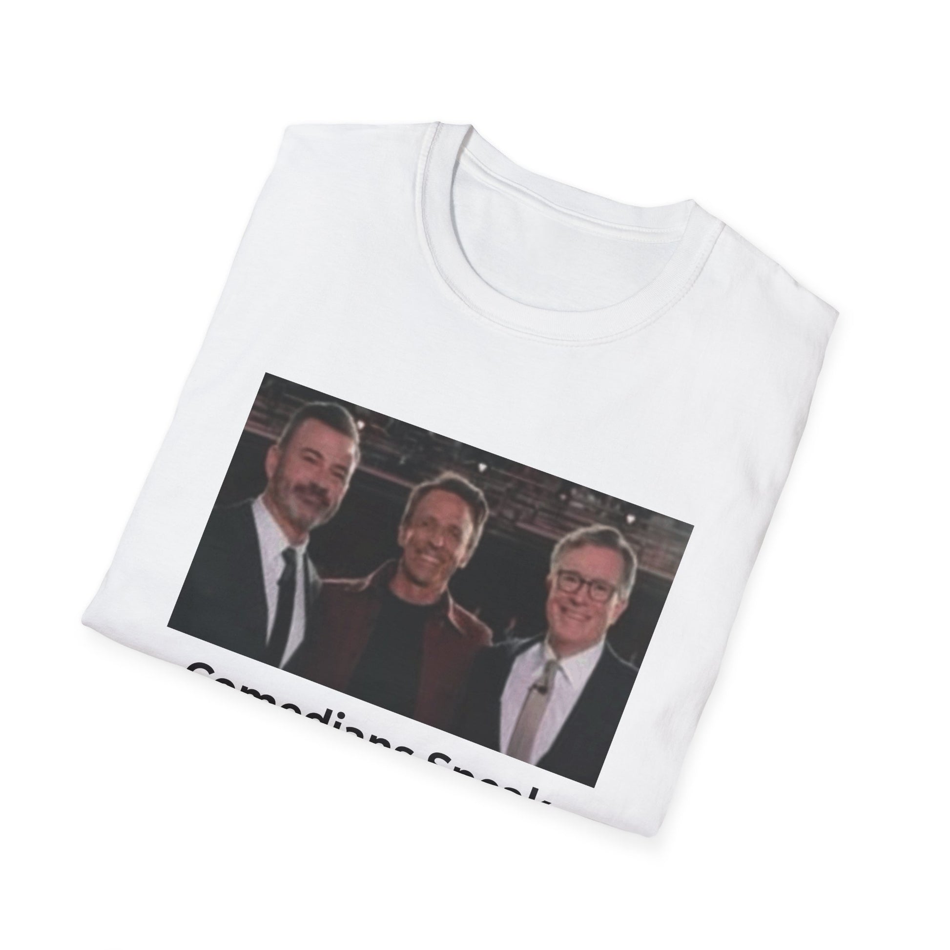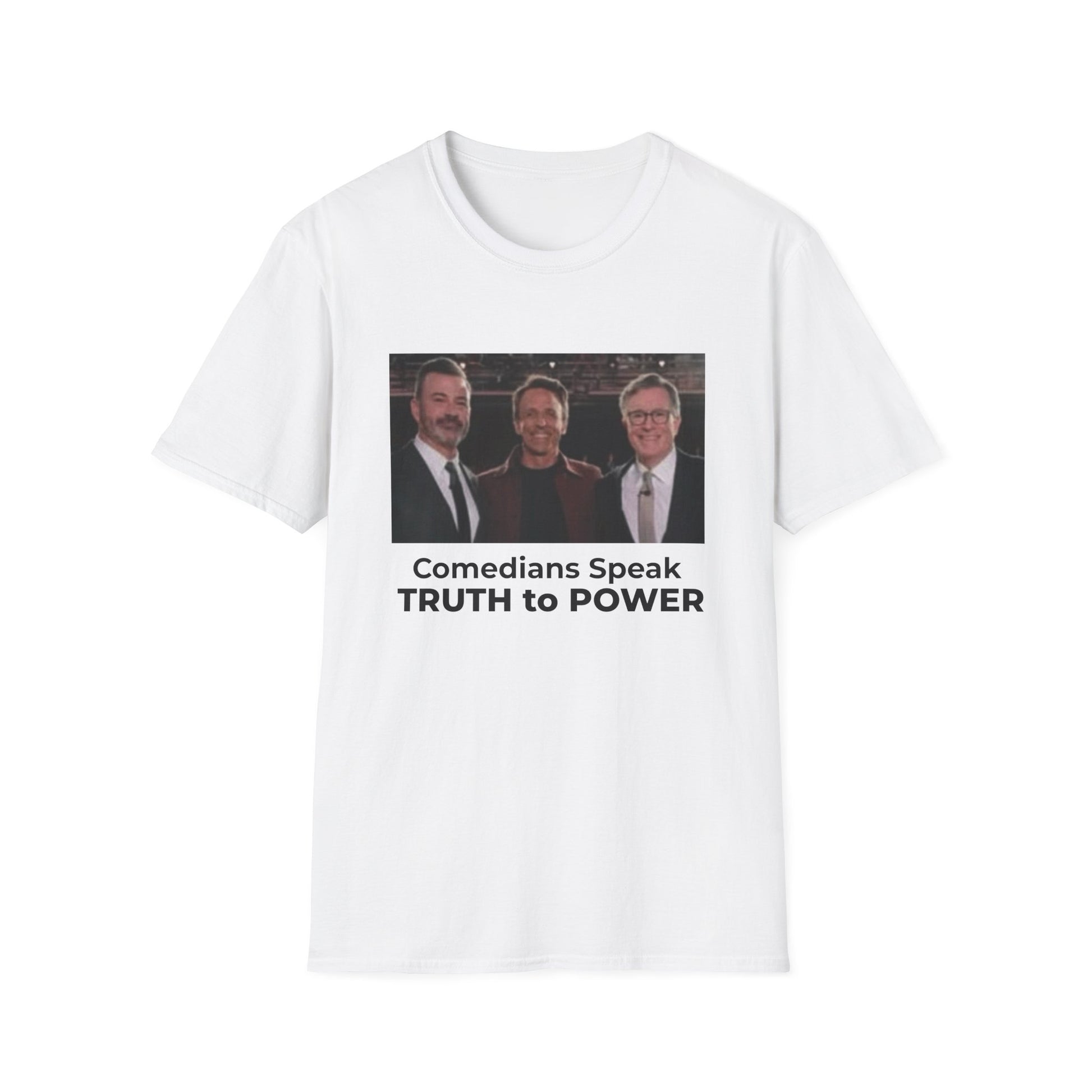Throughout history, autocrats have feared laughter — because humor cuts deeper than propaganda. This bold, single-sided tee celebrates the courage of truth-telling comedians who refuse to bow to power.