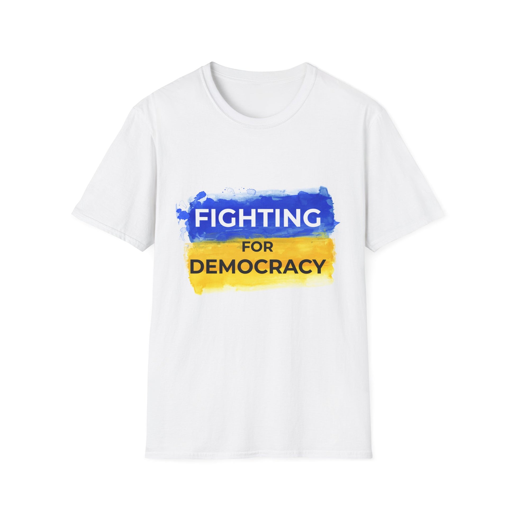 Front: Bold “Fighting for Democracy” design in blue and yellow brushstrokes — a striking call to action.