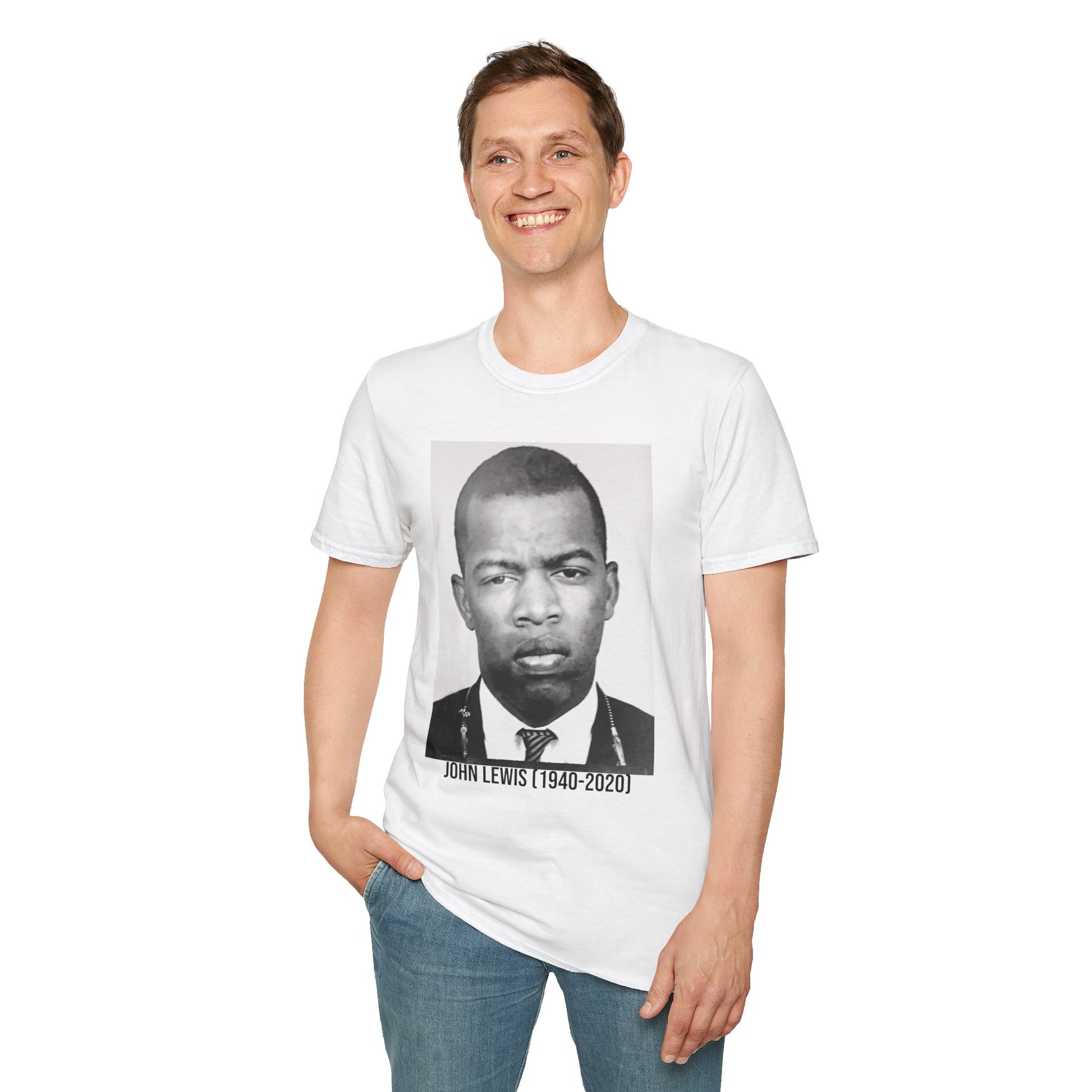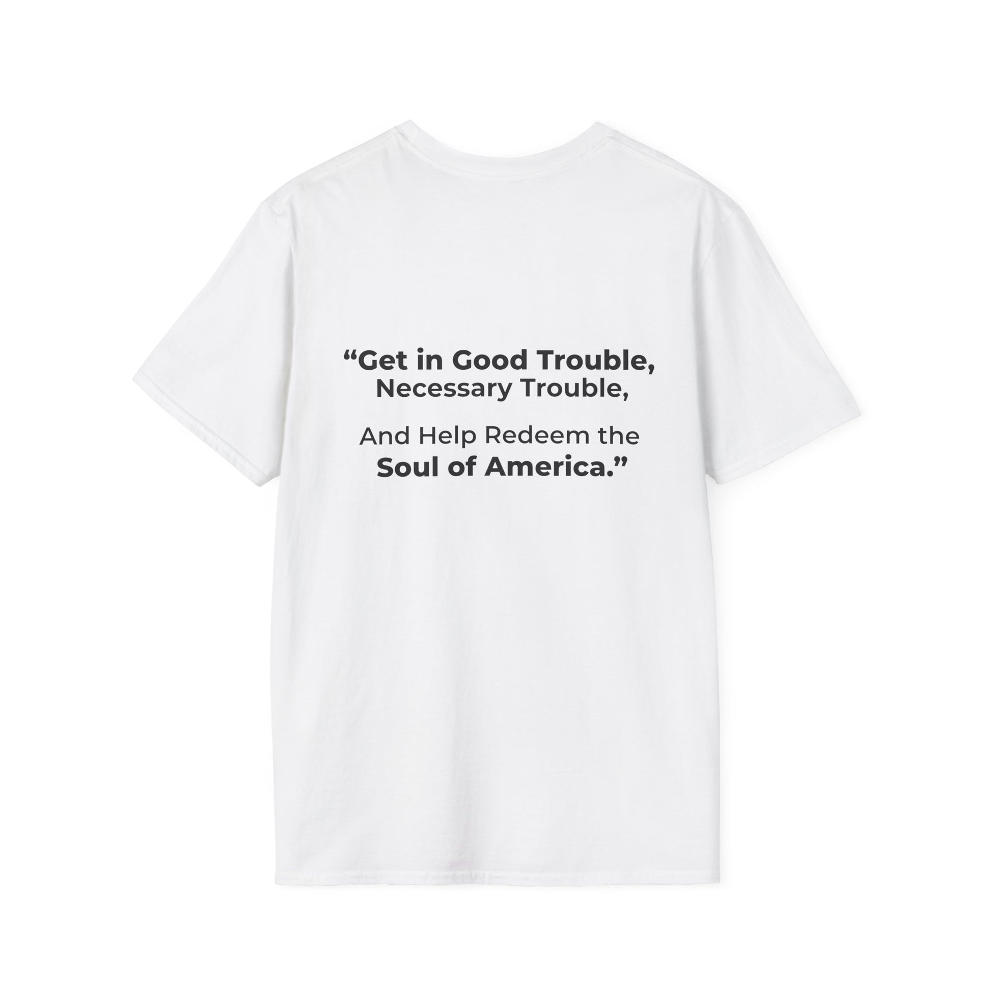 Honor the life and legacy of Congressman John Lewis with this powerful two-sided T-shirt. On the Front, a striking black-and-white image of the young civil rights hero captures the courage that defined his journey. On the Back, his iconic words blaze forth: “Get in good trouble, necessary trouble, and help redeem the soul of America.”