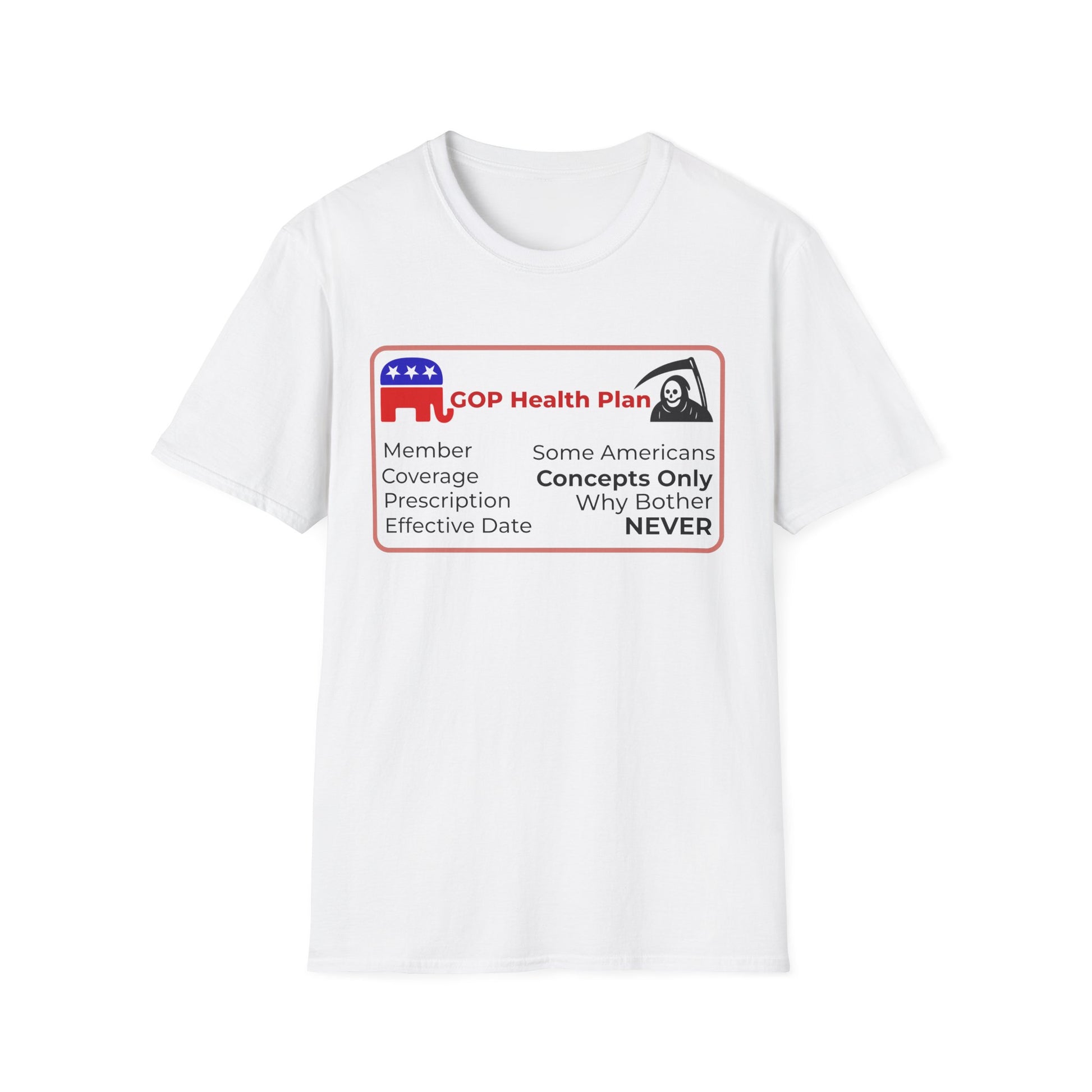 A sharp, funny, painfully accurate political satire tee. Designed like an official insurance card, this shirt exposes the reality behind the GOP’s so-called “healthcare plans” — membership for only some Americans, coverage that’s purely conceptual, prescriptions that boil down to “just wait,” and an effective date of… never.