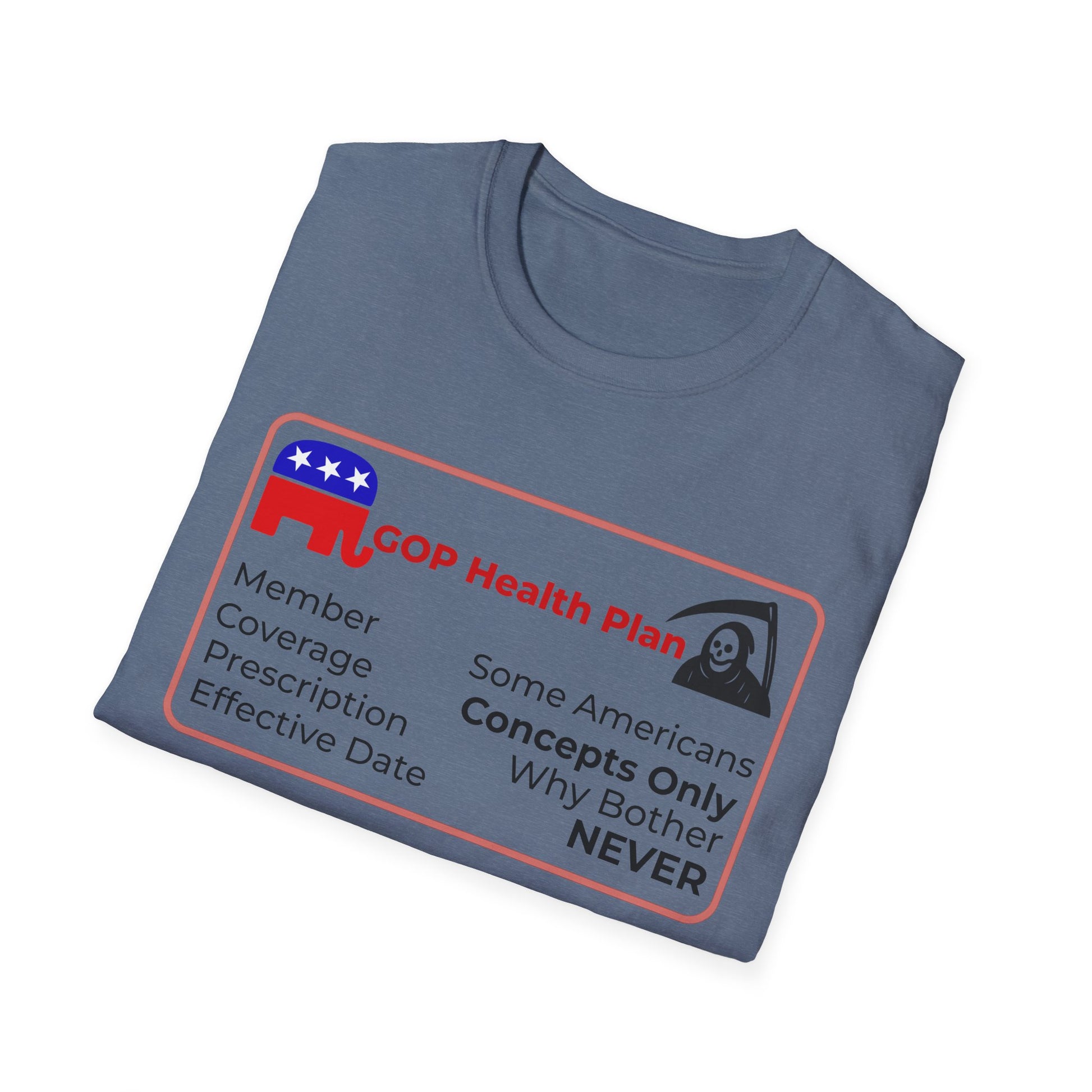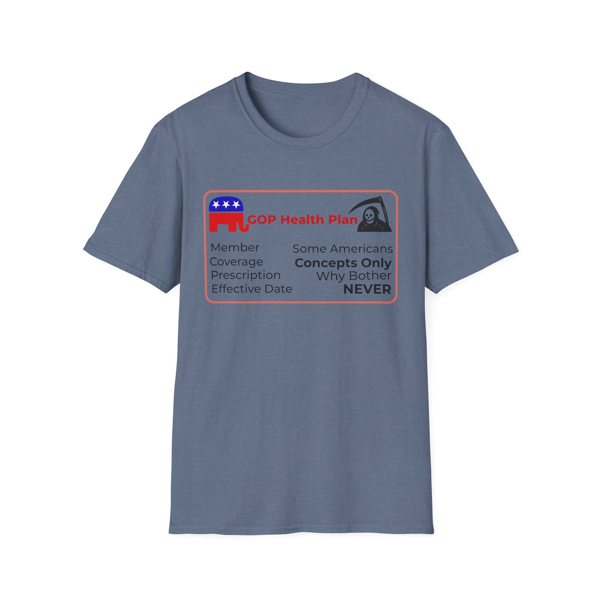 Political Health Plan Satire Insurance Card T-Shirt – Heather Indigo