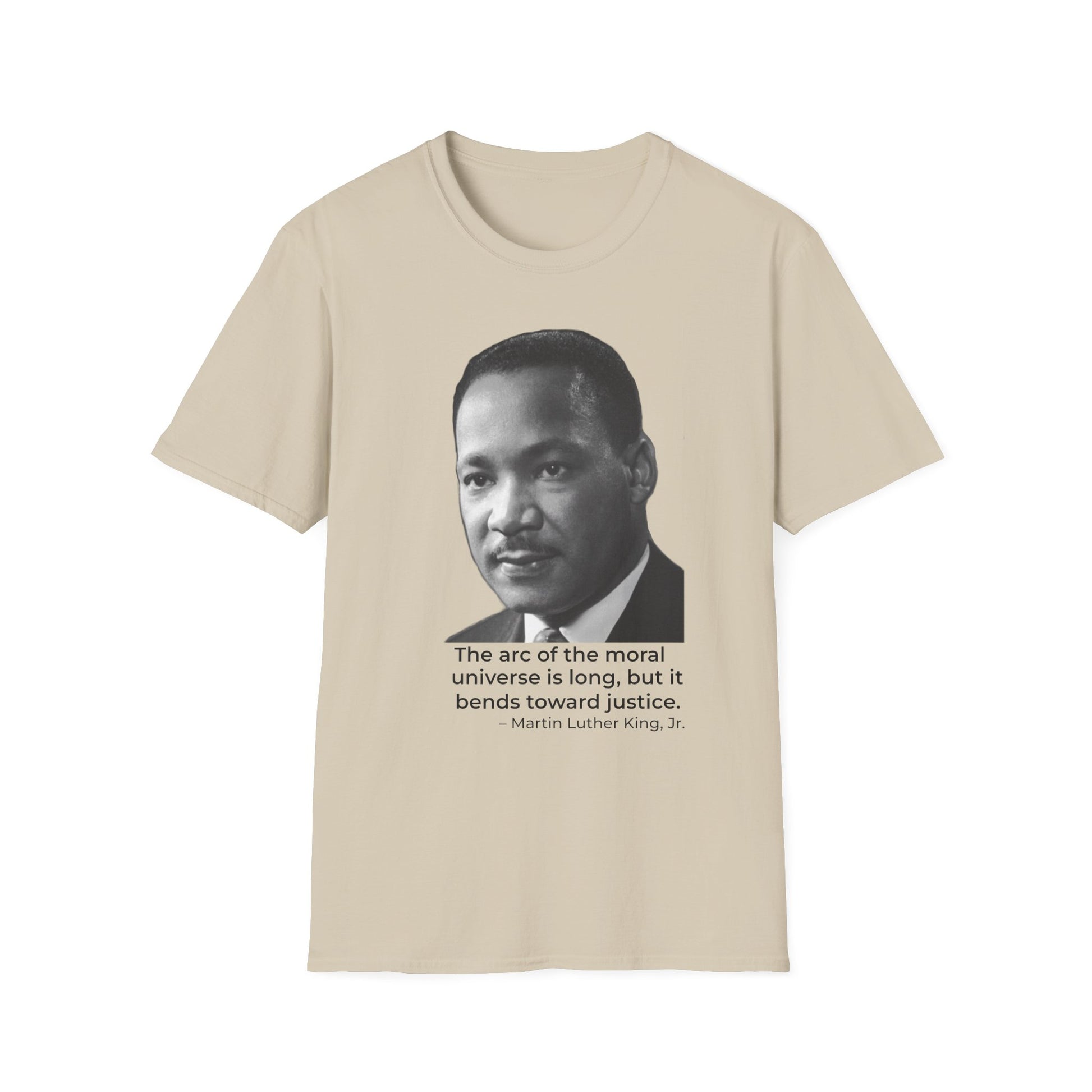 Martin Luther King Jr. Moral Arc Quote Tee – Justice Portrait Shirt (Sand)