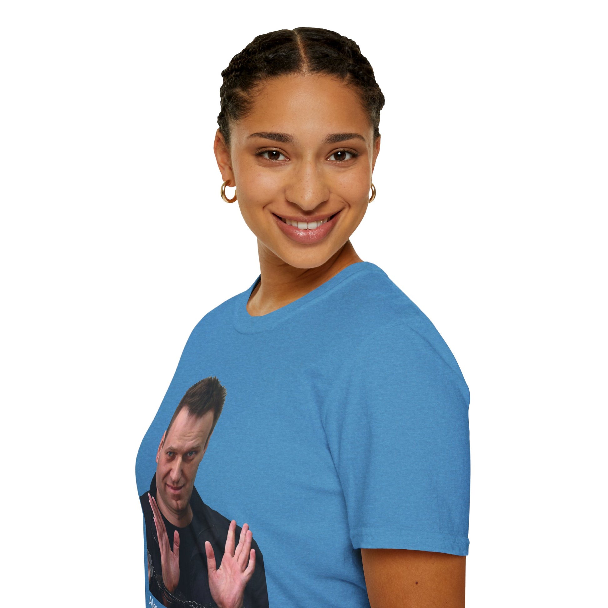 Make your voice visible with this powerful “Resist Dictatorship” tribute heather sapphire blue T-shirt. Featuring a striking image of the late Russian opposition leader in handcuffs on the front and the bold message “Resist Dictatorship in Russia and America” on the back, it’s more than apparel—it’s a wearable protest against tyranny, whether foreign or domestic.