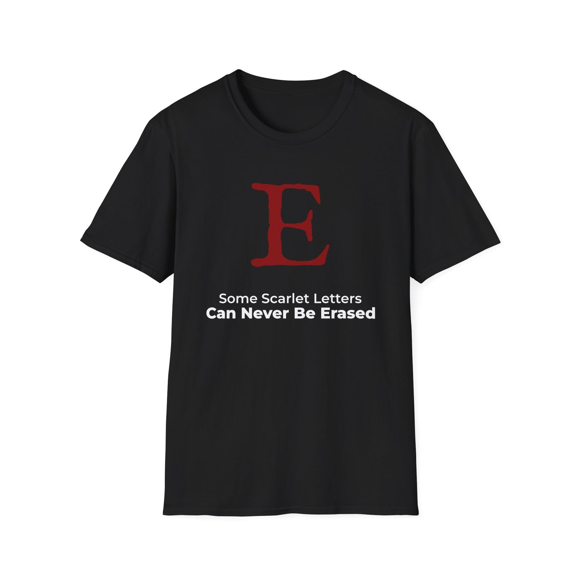 At the center of this tee is a deep scarlet E, set in an antique letterpress typeface reminiscent of 19th-century printing. Below it, the message reads: