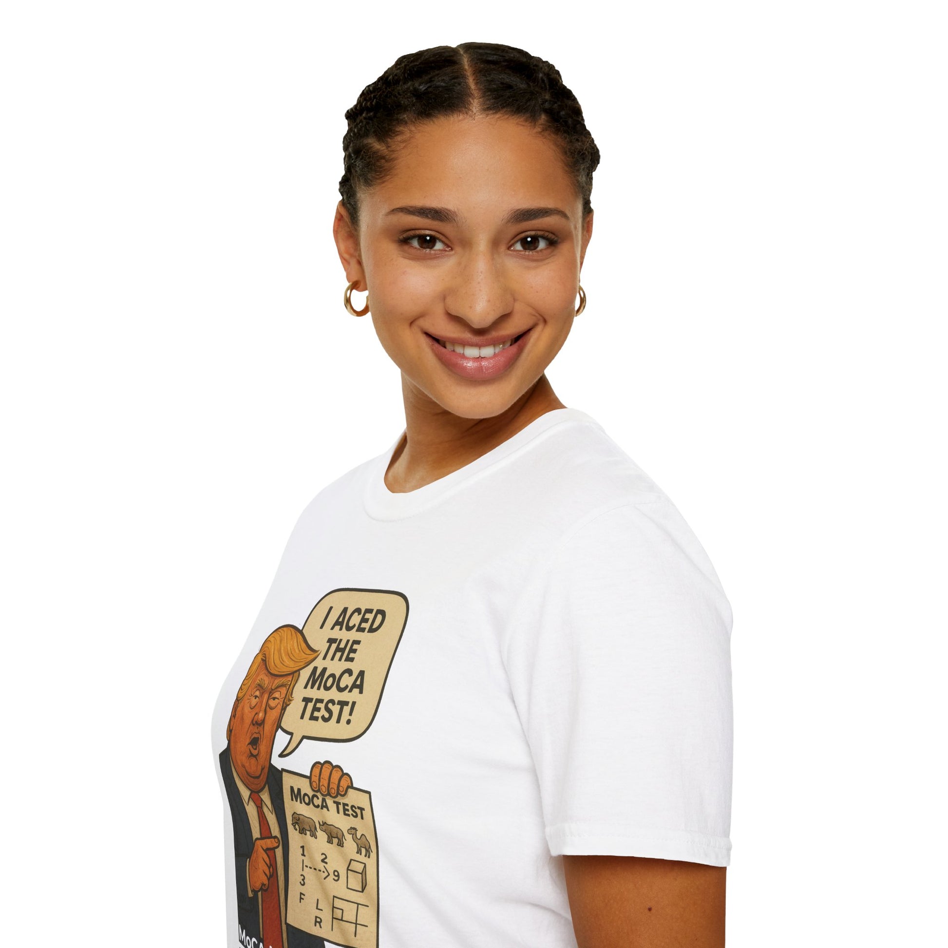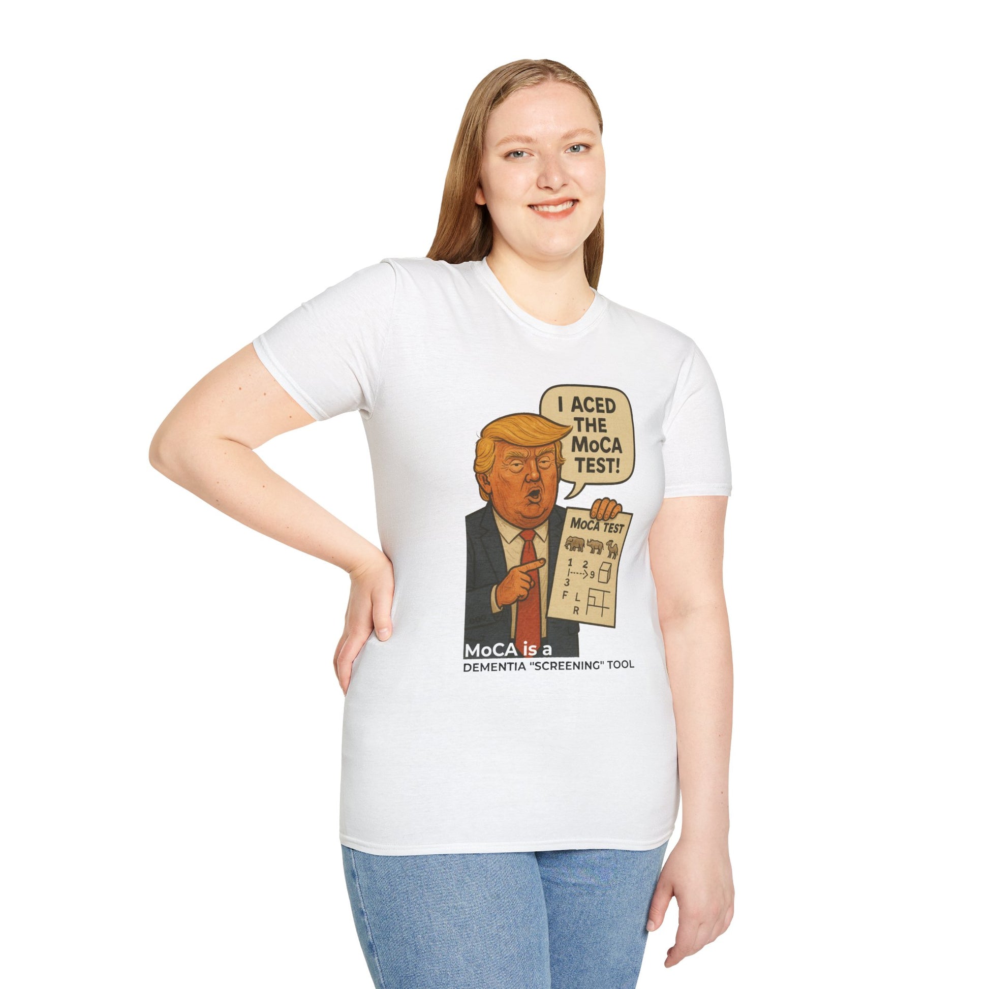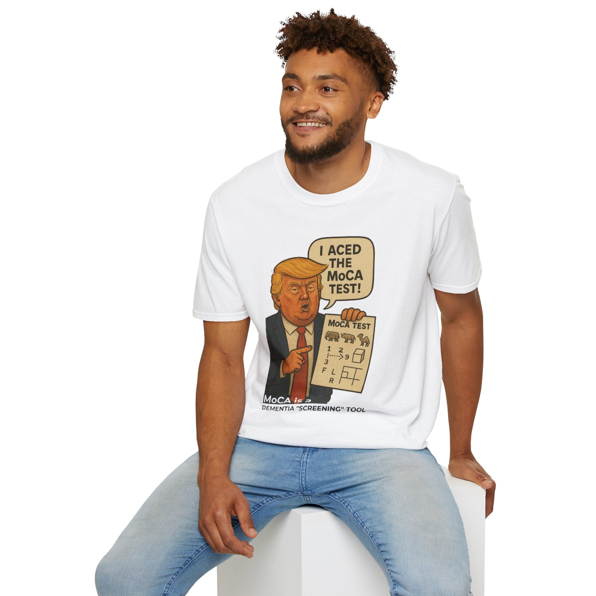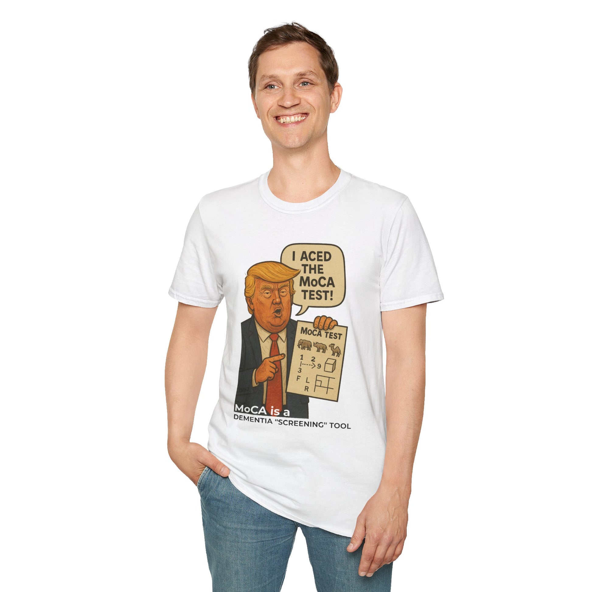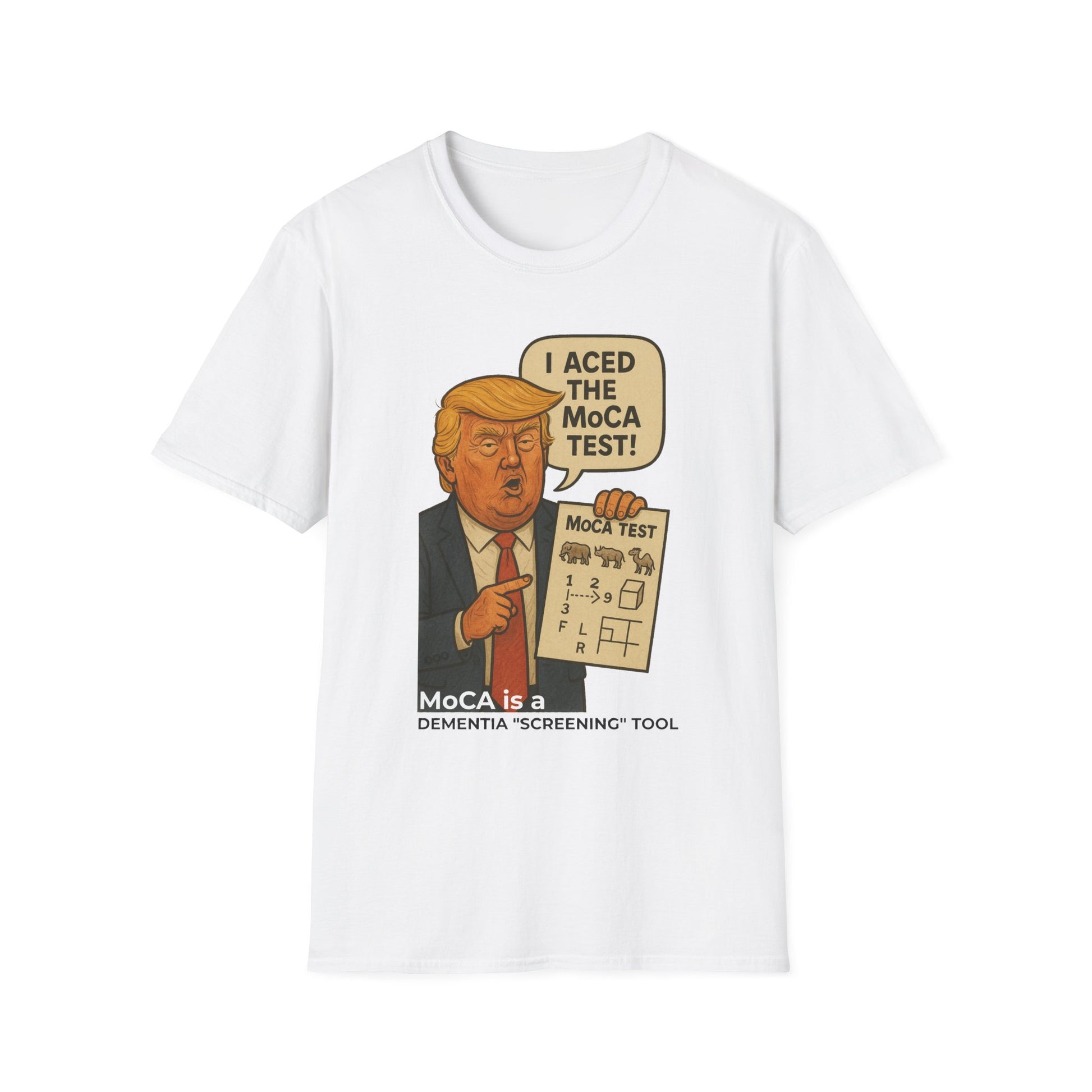 Front: Trump proudly declares “I ACED THE MoCA TEST!” — oblivious that the Montreal Cognitive Assessment is a dementia screening tool, not an IQ exam. Back: A vintage-style caricature shows Vladimir Putin manipulating Trump like a puppet, with the caption “My Useful ‘Idiot’.”