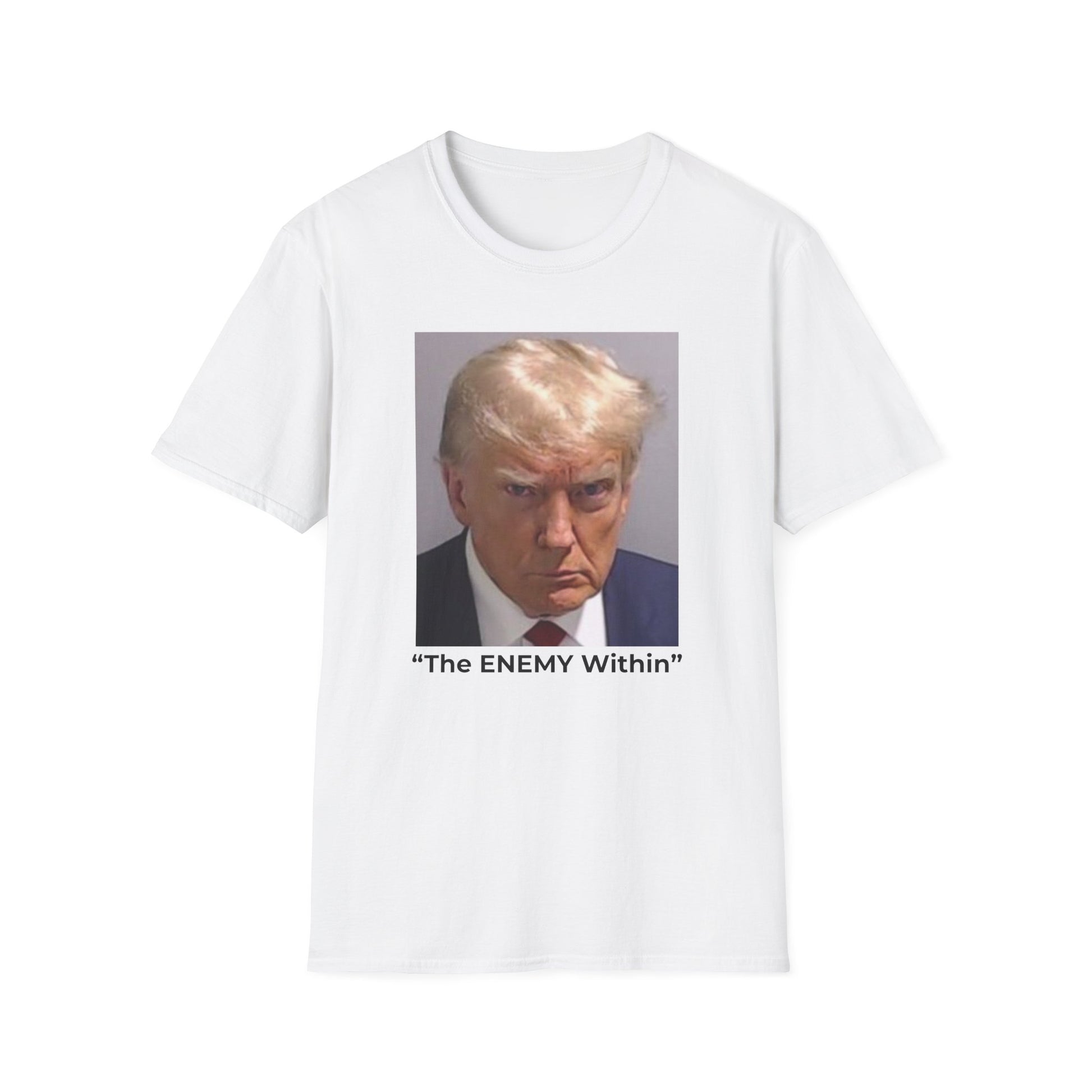 Front: Mugshot of Donald Trump with the words “The Enemy Within” — Trump’s own phrase for imaginary “far-left domestic terrorists,” turned back on him. In truth, the gravest threat to American democracy is the wannabe dictator himself. Back:NO DICTATORS inside a striking red prohibition symbol — a clear, timeless message of resistance to authoritarianism.